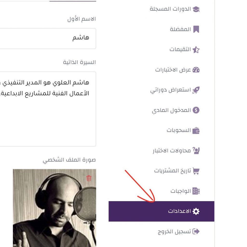 للقيام بإضافة أو تعديل البيانات الموجودة في ملفك الشخصي، يرجى الضغط على “الاعدادات” من قائمة الخيارات الموجودة في الجهة اليسرى