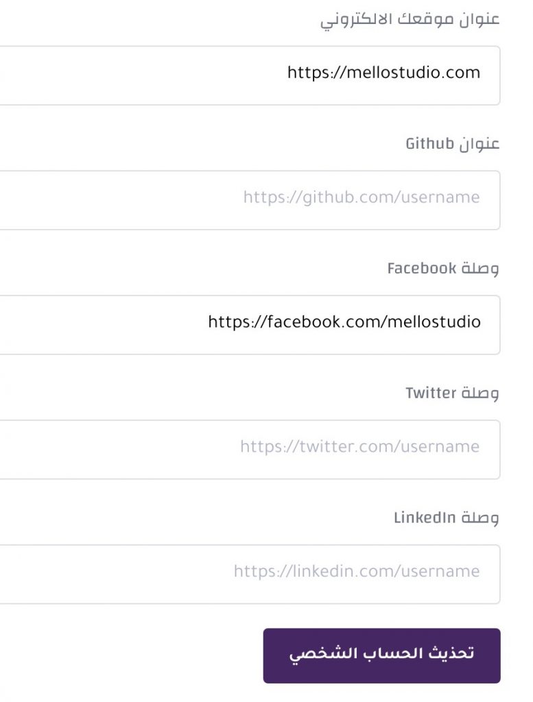 لإضافة الوصلات الخاصة بشبكات التواصل الاجتماعي، تصفح الى أدنى صفحة الاعدادات وقم بملأ الخانات المطلوبة مثل  عنوان صفحتك الخاصة على الانترنت، وصفحة الفيس بوك، وحساب التويتر وغيرها من المعلومات.